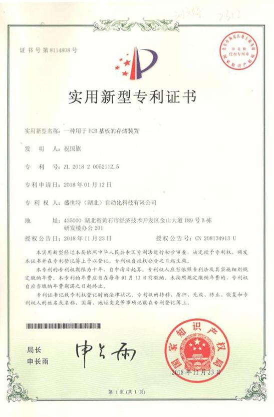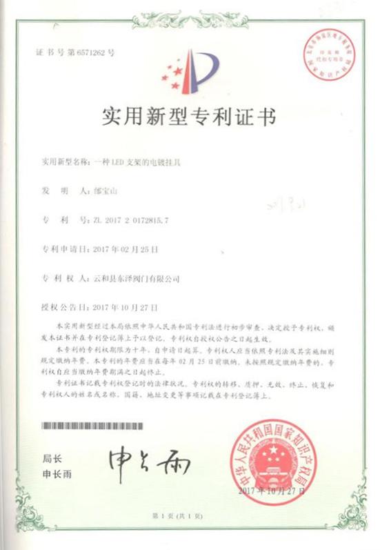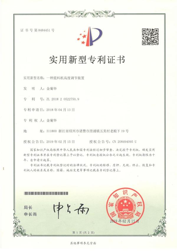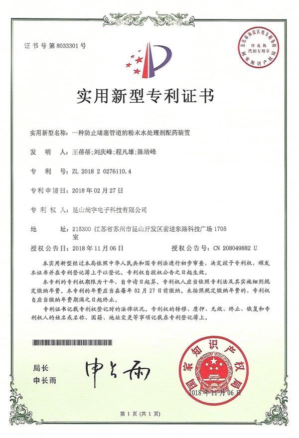 A dispensing bucket with dust removal device - utility model patent certificate (signature and seal)